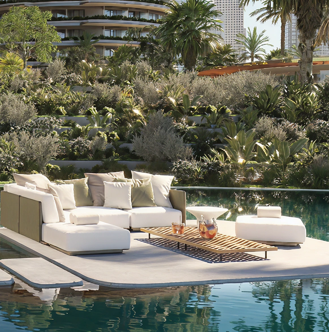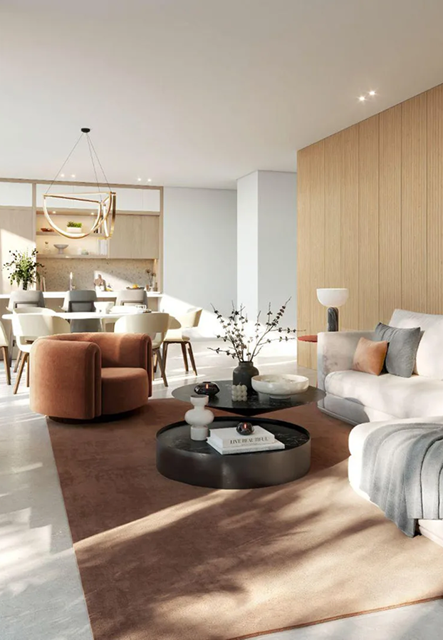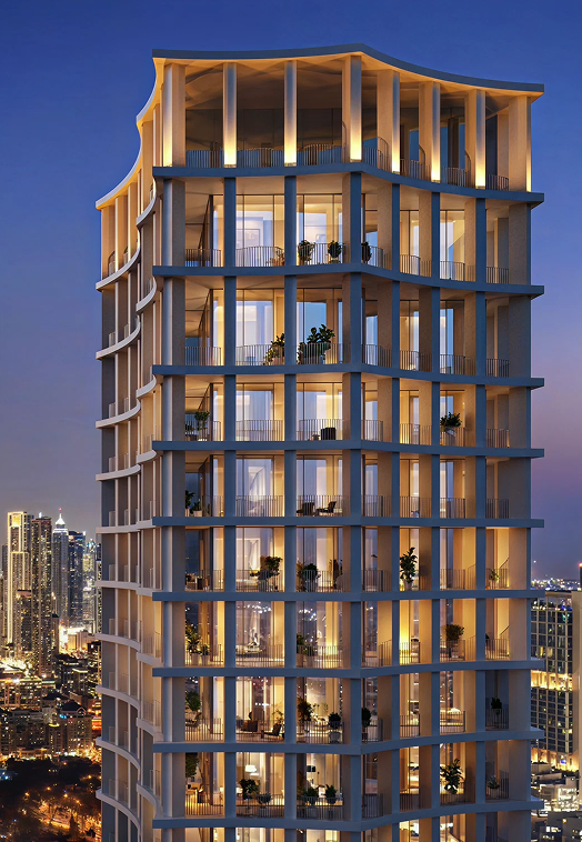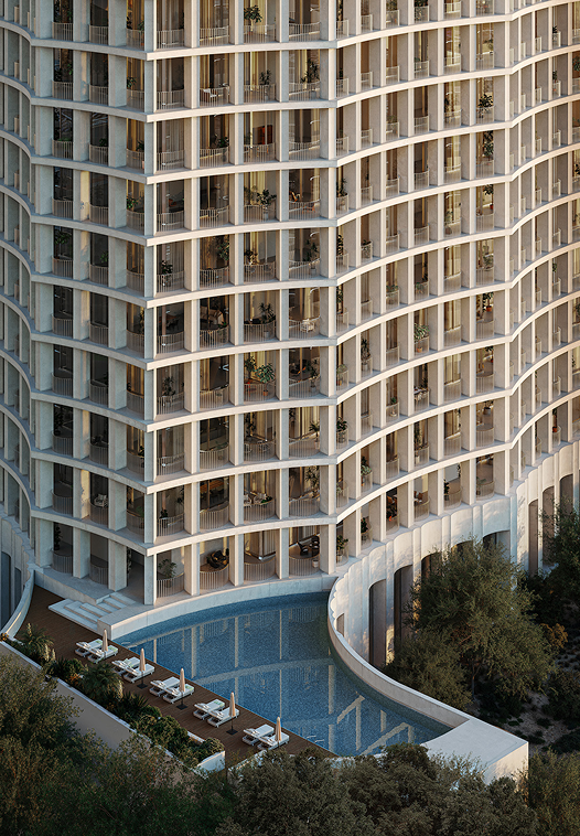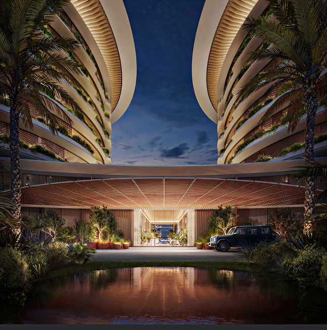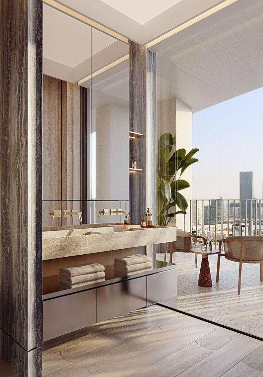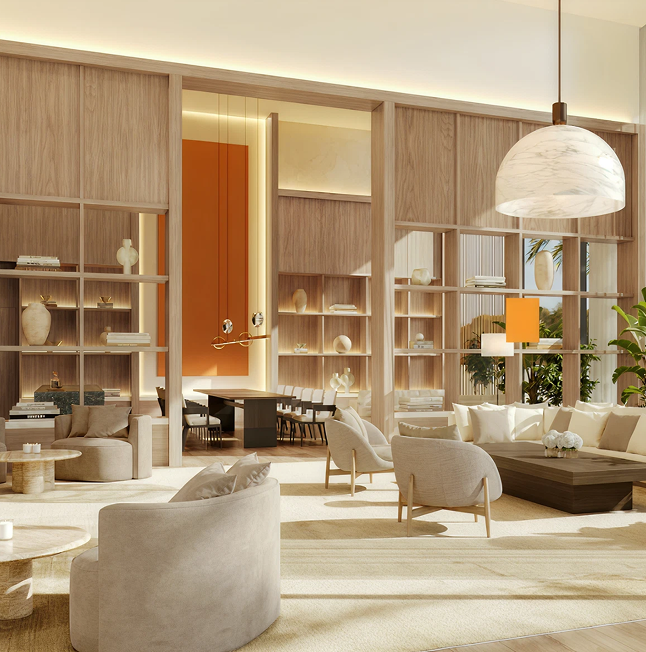 Graceful setbacks, full-height panoramic glazing, and natural materials such as timber, stone, and anodised metal define the architecture. Interior design by Rockwell Group enhances the space with immersive brand detail, complemented by lush landscaping, vibrant social and private spaces, and effortless access via a new bridge connecting directly to Sheikh Zayed Road and Dubai’s key attractions.